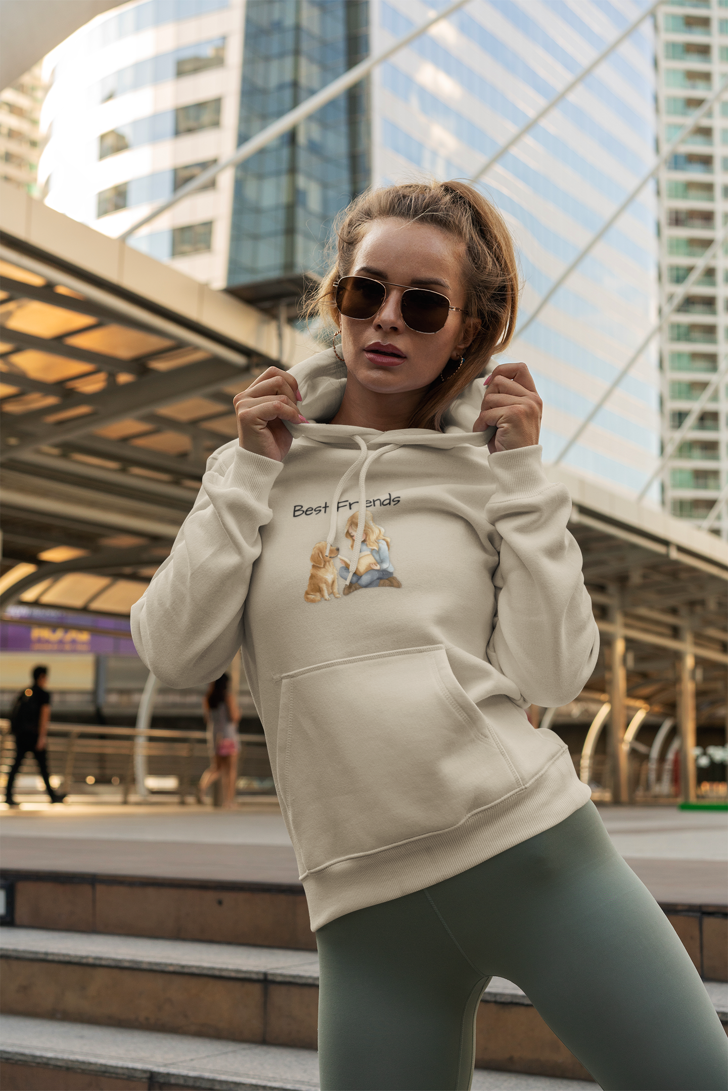 It's a chilly Saturday morning and you're heading out for a coffee run with your Golden Retriever. You slip into this cozy hoodie, and immediately feel the soft cotton-polyester blend against your skin. The cute 'Best Friends' design makes you smile – it perfectly captures the bond you share with your furry companion. At the café, fellow dog lovers compliment your hoodie, and you end up chatting about your pets. The kangaroo pocket keeps your hands warm while you hold the leash, and later holds treats for your pup. Back home, you curl up on the couch for a movie marathon, your Golden snuggled beside you. The hoodie is so comfortable you don't want to take it off. Friends visit and immediately ask where you got it – they want one too! It becomes your go-to for dog park visits, casual outings, and cozy nights in. When it needs washing, you toss it in the machine and it comes out looking perfect. This hoodie isn't just clothing – it's a celebration of the best friendship you've ever known, the one with four paws and unconditional love!