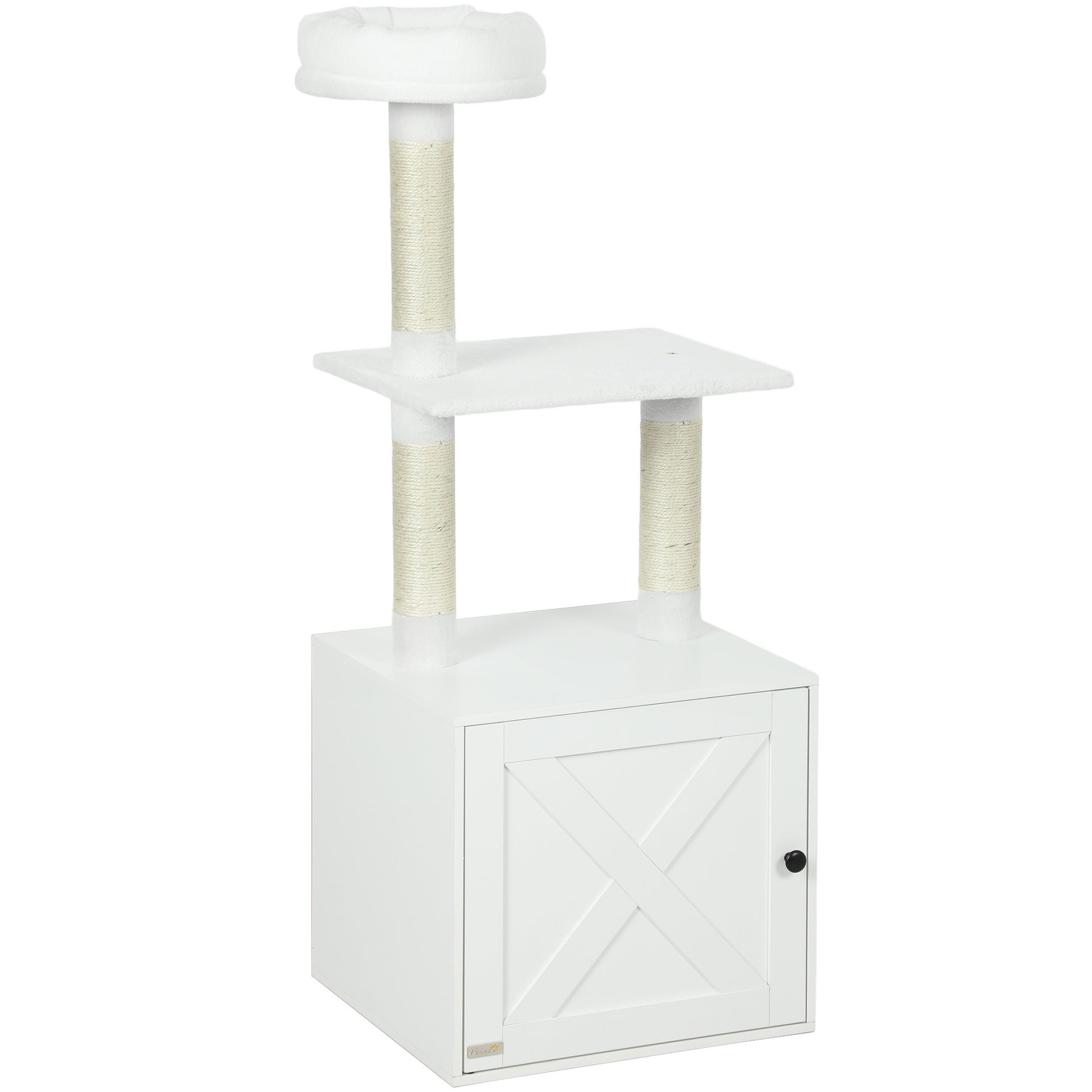 🐱 The Ultimate All-in-One Cat Tree with Hidden Litter BoxTransform your cat's world with our revolutionary Cat Tree with Litter Box Enclosure! This isn't just a cat tree – it's a complete feline entertainment and privacy center that combines climbing fun with discreet litter box storage. With multiple scratching posts, cozy bed, climbing platforms, and a hidden litter compartment, this white tower maximizes vertical space while keeping your home organized and odor-free.
