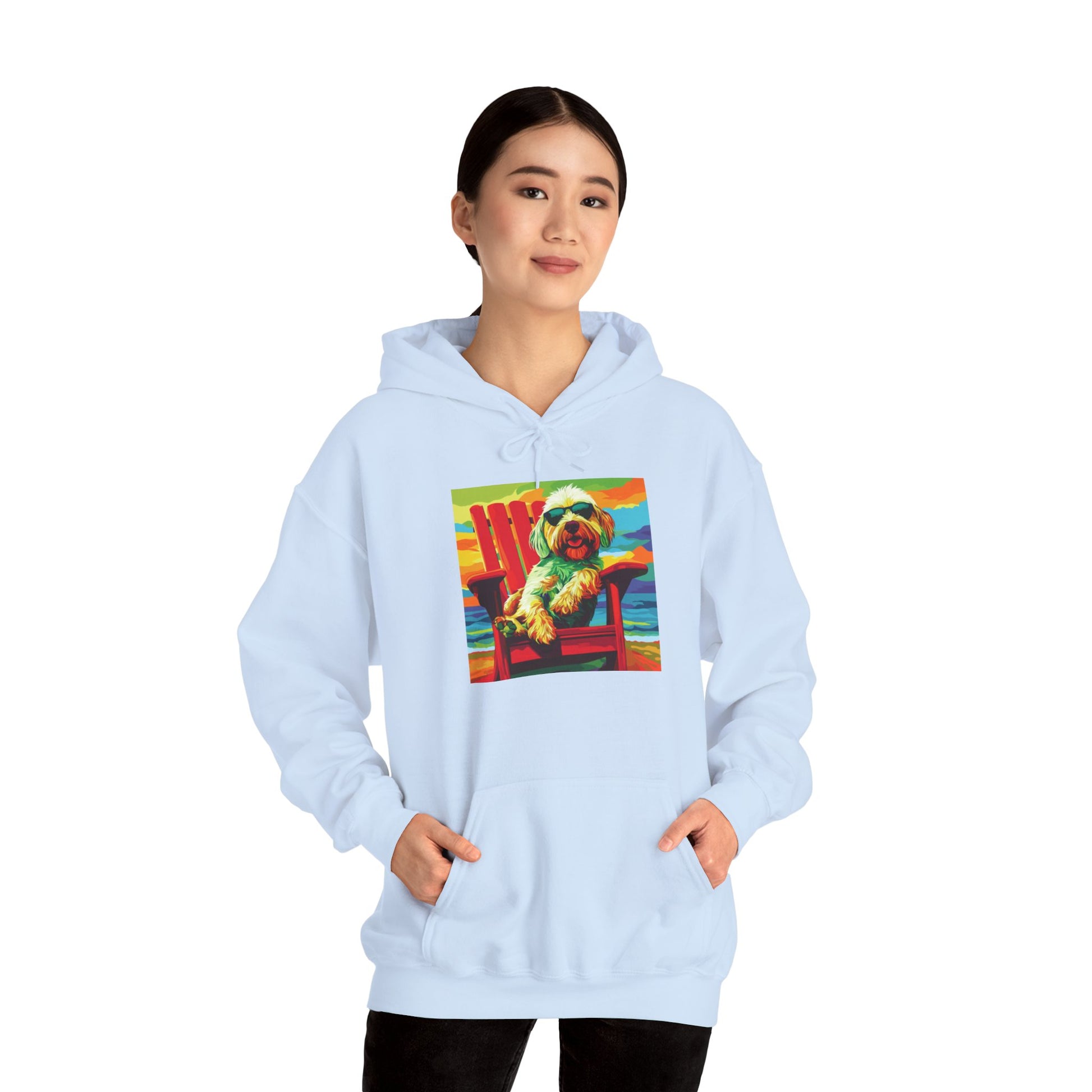You're a proud Goldendoodle parent and you've been searching for apparel that truly captures your Doodle's vibrant, playful personality. Then you discover this colorful Goldendoodle hoodie. The moment you see it, you smile – the vibrant art perfectly represents that joyful, goofy spirit your Doodle has. You slip it on and immediately feel the soft, heavy blend fabric. It's cozy without being too heavy, perfect for those morning dog park visits. At the park, fellow Doodle owners stop you constantly. "I love your hoodie! Where did you get it?" You end up exchanging Goldendoodle stories, bonding over the unique quirks only Doodle parents understand. The kangaroo pocket is perfect for holding treats and poop bags during walks. Your Doodle seems to recognize their likeness on your hoodie and gives you extra cuddles. Throughout the day, the hoodie keeps you comfortable whether you're running errands, working from home, or lounging on the couch with your furry friend. When it needs washing, you toss it in the machine and it comes out looking just as vibrant. This hoodie becomes more than just clothing – it's a conversation starter, a way to connect with other Doodle lovers, and a celebration of the special bond you share with your Goldendoodle!
